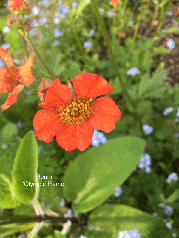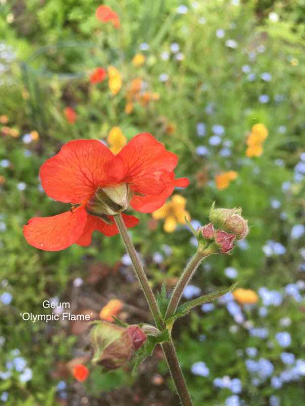 This geum turned up in my garden many years ago and has been so exceptional I decided to name it. It has bright orange upward -facing single red/orange flowers. The calyx is green and reflexed. Strong stems grow to approx 70cm. Clumps spread to 30cm. Diameter of the flowers 4cm. Flowering time from mid April to mid to late June.